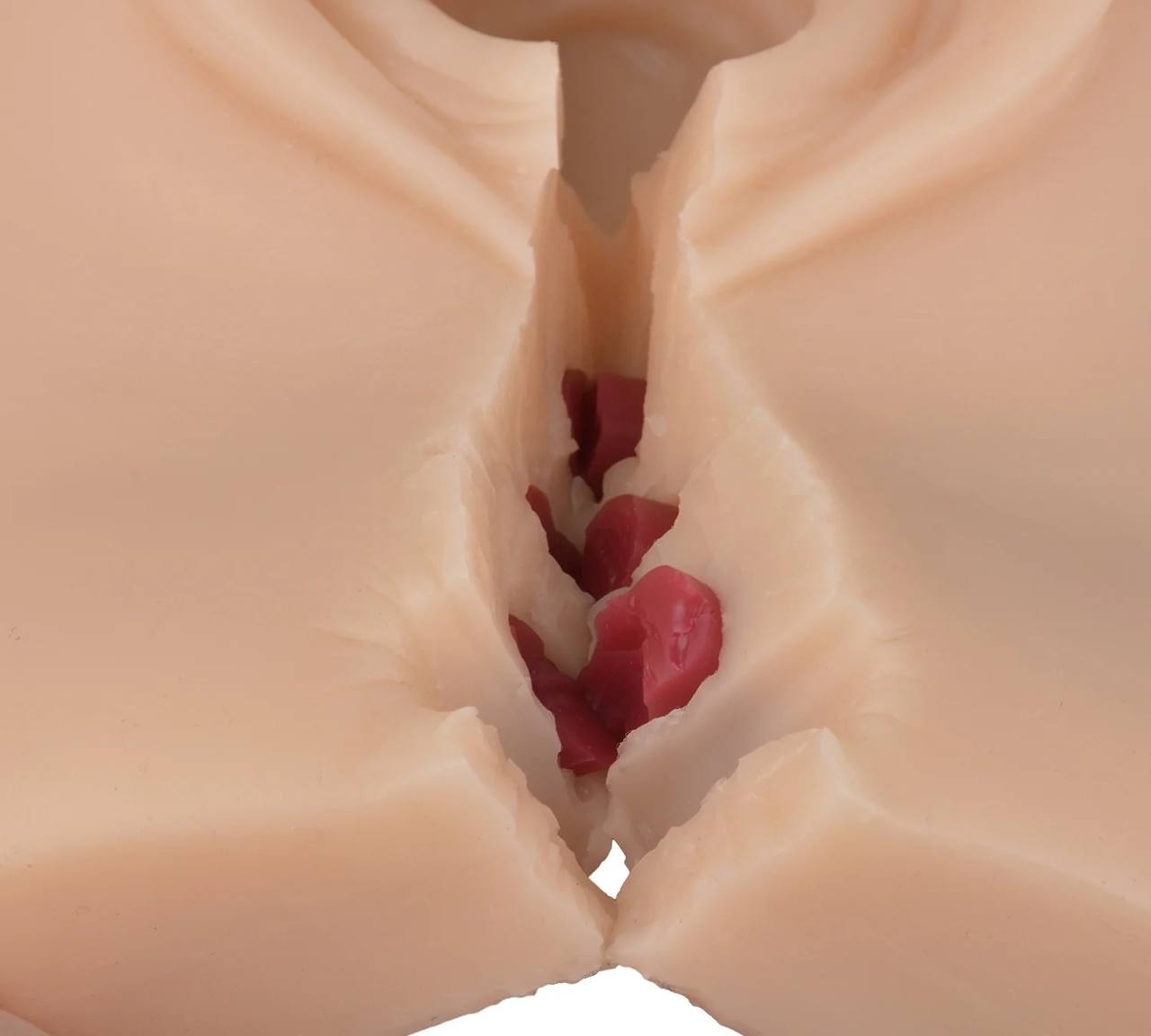 Тренажер предназначен для обучения навыкам наложения швов при разрывах и рассечениях промежности, которые являются наиболее частыми проявлениями патологий в акушерской практике. Материал наружных половых органов визуально и пальпаторно имитирует кожу человека.