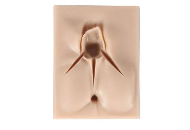 Тренажер представляет собой блок внешних половых органов женщины, включающим имитацию рассечения кожных тканей.