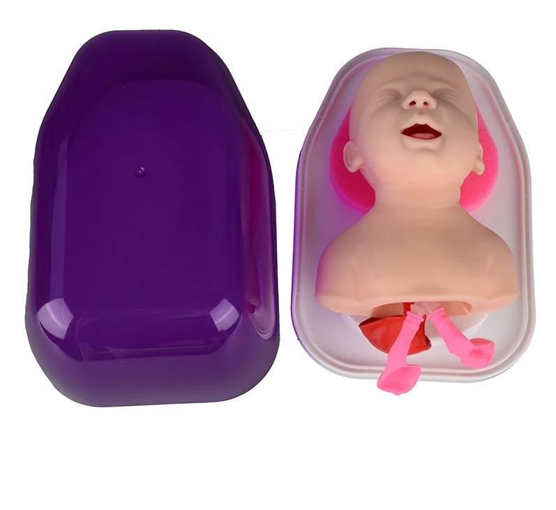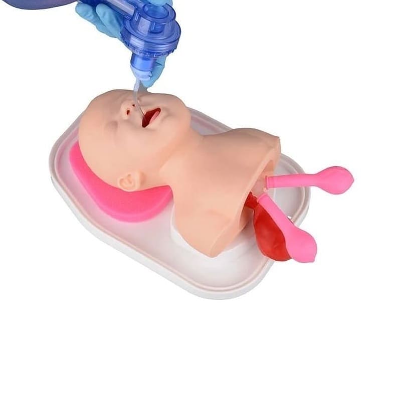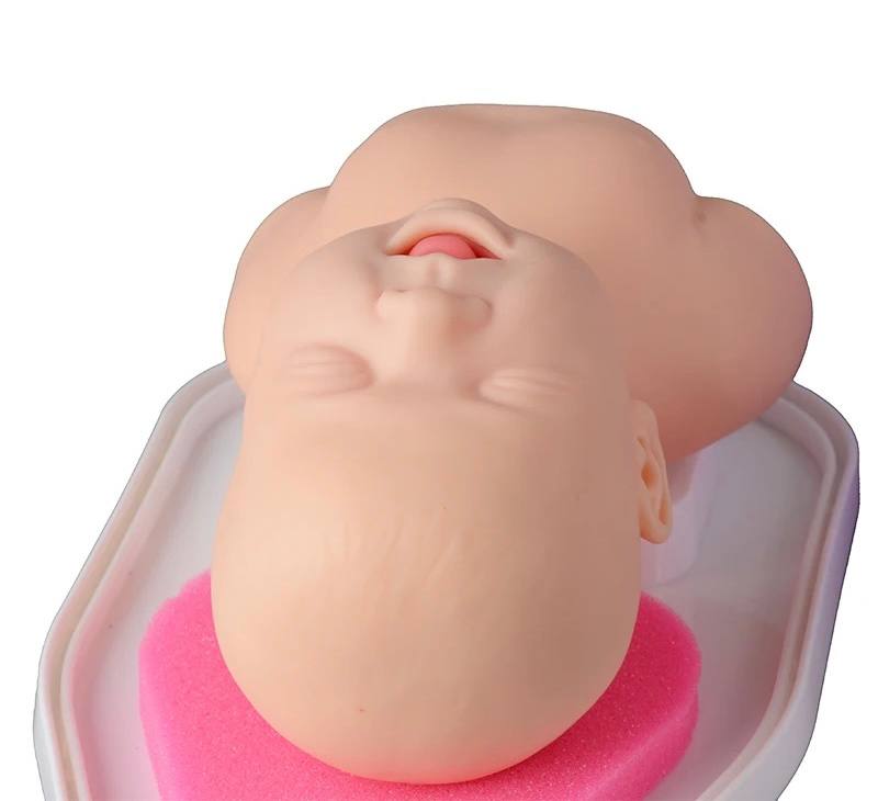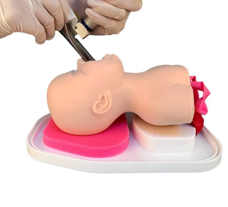 Тренажер представляет собой модель головы младенца с дыхательными путями на подставке